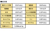 フレッシュポーク・ドライポーク・全粒オーツ麦・全粒黍・ガルバンゾー豆・玄米・フラックスシード・醸造酵母・米ぬか・卵・カノラオイル・キヌア・塩・ニシンオイル・塩化カリウム・プロピオン酸カルシウム・リン酸一ナトリウム・タウリン・塩化コリン・DLメチオニン・パンプキン・ブルーベリー・チコリ根・クランベリー・ローズマリーエキス・緑イ貝・ユッカシジゲラ・ドリアン・アガリクス・ストレプトコッカス サリバリウス(口腔内善玉菌)・エンテロコッカスフェカリスEF2001・プロテオグリカン(サメ由来)・炭酸カルシウム・セレン酵母・キレート鉄・キレート亜鉛・ビタミンE・ビタミンC・硫酸銅・キレートマンガン・ナイアシン・パントテン酸カルシウム・ビオチン・リボフラビン・ビタミンA・チアミン硝酸塩・ビタミンK3・ビタミンB12・ピリドキシン塩酸塩・ビタミンD3・ヨウ化カルシウム・葉酸